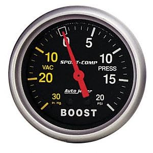 Auto Meter Sport-Compact Mechanical Boost / Vacuum Gauge are used to measure pressure. They are commonly mounted on the dashboard, on the driver's side pillar, or in a radio slot. Auto Meter Sport-Compact series is a hardcore instrument panel that will stand up to any brutal racing environment. Years of experience designing versatile gauges have made the Sport-Compact series the ultimate choice of racers worldwide. Sport-Compact gauges include mounting hardware and light. It became the absolute standard in all forms of racing due to its bold appearance, state-of-the-art technology and unrelenting construction. A boost gauge will measure pressure in either psi or bar and many measure manifold vacuum pressures also in inches of mercury (in. Hg).The overall diameter of this mechanical boost gauge is 2-1/4 and reads from 0-30 Hg/ 0-20 PSI. The mounting hole is 2-1/16 and the mounting depth is 1-9/16 (3 including rear mounting shaft). It includes red and green bulb covers for customized look.