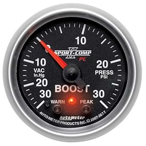 Auto Meter 2-1/16 inch (52.4 millimeter) Vacuum/Boost Peak and Warn with Electronic Control, 30 in. Hg/30 pounds per square inch, Full Sweep Electric, Sport-Comp II PCare powered by digital microprocessor-controlled, rugged stepper motor drives and laboratory grade sending units. These Full Sweep Electric Gauges are the BEST gauges available. They combine Extreme Durability and Readability of 270 degree sweep mechanical gauges with the easy installation and safe operation of short sweep electrics. Track tested and race proven, these units use precision senders to keep hazardous fluids out of the driver compartment and perform gauge calibration and sensor diagnostics at power up for extreme accuracy, every time. Most units compatible with Auto Meter Data Logger for the ultimate race info center. Full Sweep, Stepper Motor meter movement. Includes 8 ft. tubing or wiring harness. Includes MAP sensor. Includes T-fitting. Peak recall/memory.